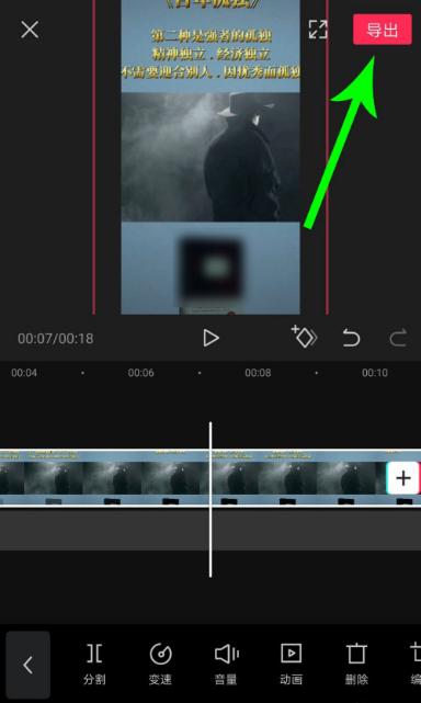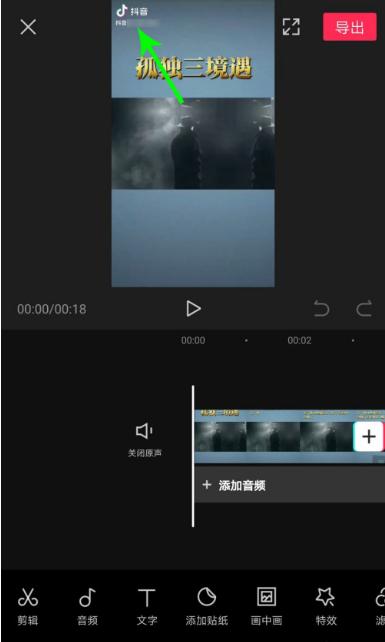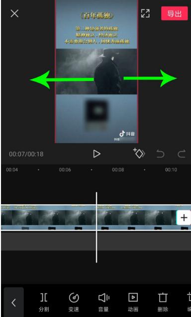 2、选中视频素材后,两根手指同时按住编辑区的视频画面,然后同时向两侧拖动,放大视频素材,直至抖音号水印从画面中消失为止,然后单击导出视频即可。