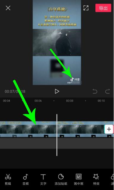 6、画中画视频缩小以后,拖放置抖音号水印位置,将其遮盖起来,而后单击导出即可。
