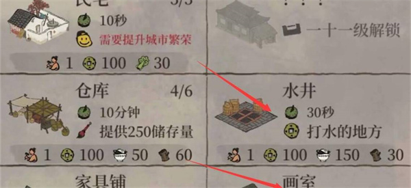2、然后,在建设时,水井和画室最赚钱,前期可以在雕像范围内多建一些水井, 解锁画室后再建画室。