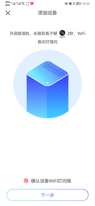 三、按照提示开启除湿机,确认设备WiFi灯闪烁后,点击下一步