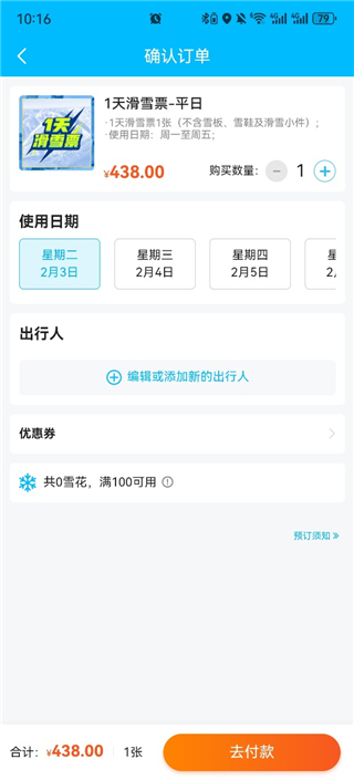 1、支持与好友组队团购门票,团购可享受更优惠的价格,降低滑雪出行成本。