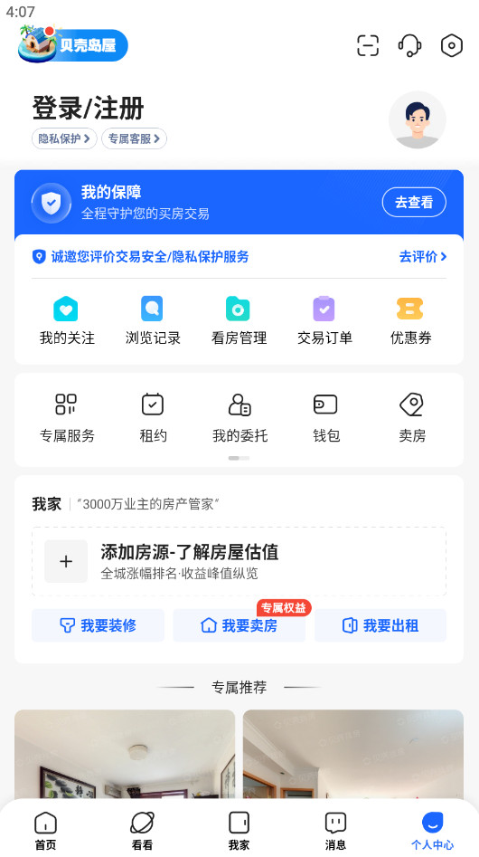 打开贝壳找房app,点击底部的个人中心