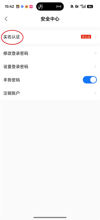 4、在安全中心界面中,找到并点击“实名认证”选项,启动认证流程。