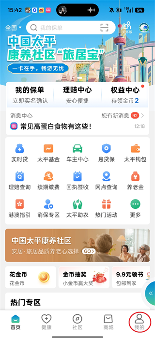 1、打开太平通app,找到并点击屏幕右下角的“我的”栏目,进入个人界面。