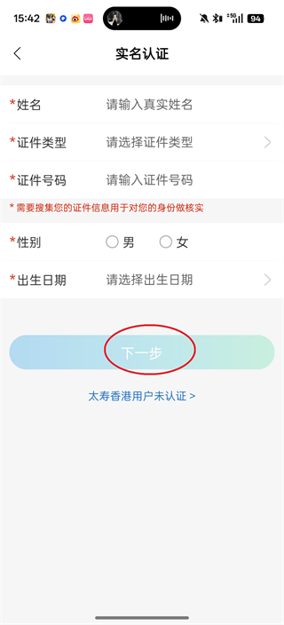 5、输入相关真实个人信息,确认无误后点击“下一步”,完成人脸识别即可完成实名认证。
