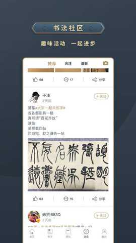 3. 社区互动功能:还有一个社区功能,在这里用户可以分享自己写过的作品、交流心得,并与其他热爱书法艺术的人进行互动。