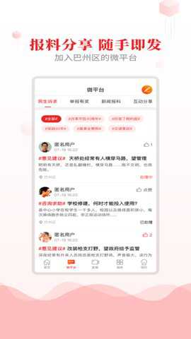 1、微平台为用户带来各种新闻爆料、民生诉求和有奖等信息。