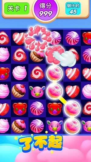 2、轻松又刺激的滑动操作,随时感受到消除的乐趣,消除相同的糖果,挑战高分。