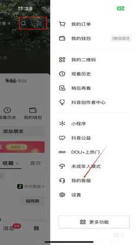 打开抖音”我“的界面,找到右上角三横下“我的客服”。