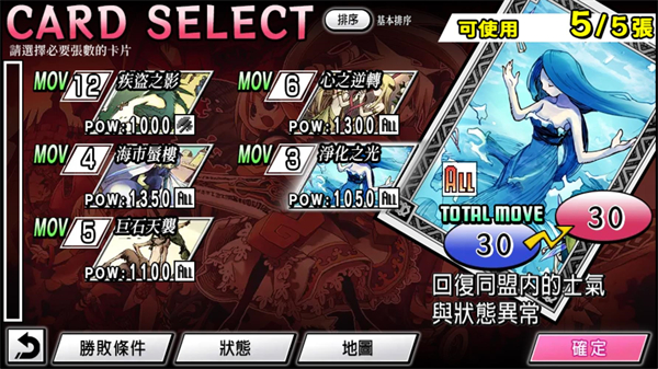2、每张卡片除了能用来战斗,都有各自的MOV,MOV决定我方这回合所有角色能移动的总格数。但是一旦用完卡片就会GAME OVER,请务必分配好卡片的使用。有些关卡触发第二阶段时会回复卡片使用状态。游戏后面会解锁连携战斗,决定进行攻击的角色为联盟队长,其阵型内所有角色都会参与战斗。在后期还会解锁二次连携,让阵型判定扩大。