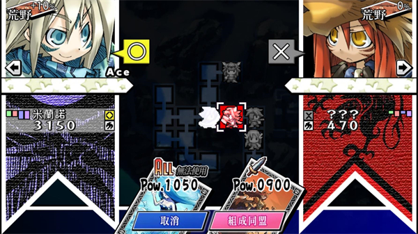 6、卡牌的POW代表卡片的攻击力,通过战斗胜利可以成长,如果打倒boss会成长更多。注意同时培养全部卡片会变得平庸,记得自行选择哪些卡不培养,哪些卡用来打倒boss快速成长。比如米拉诺专用的疾风卡,开局只有1000pow,如果一直没培养,后期会因为很弱让战斗变难。卡片是有严格使用条件,卡片右下角图案(ACE)上显示【ALL】表示全员都能使用,斧头图案就必须队长是斧头角色才能用,后期能获得无视ACE限制的道具。除了ACE,有些卡片只能白天(夜晚)释放,又或者12MOV那张疾风卡的技能只有主角米拉诺才能用(但是可以让别的斧头角色当队长)。