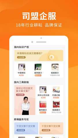 司盟企服是一款深圳市中港星互联网科技有限公司打造的在线为企业用户提供企业管理、信息查询、风险检测、海内外注册、资质办理、全球知识产权、财税审计服务、评估服务、服务等4000多项专业服务的一站式智能企业服务。该应用以企业经营一体化为核心,提供注册、资质办理、财税审计等服务。用户可以通过一键下单,在线办理,更加快捷方便。