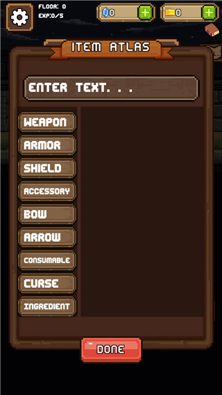配饰:自身不可被使用,但跟据摆放位置,能强化武器、防具、道具的物品。不过有时这些物品也会给其它物品带来负面效果。