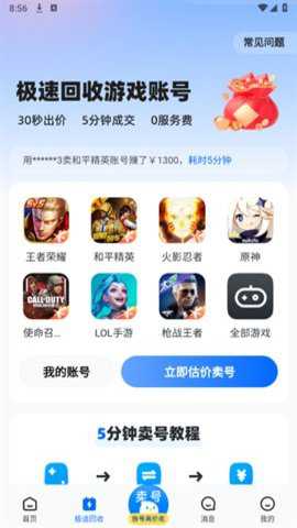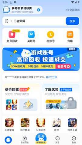 3、如果你有闲置账号,卖号号平台也能够帮你快速回收,只需30秒估价,5分钟即可成交。