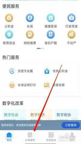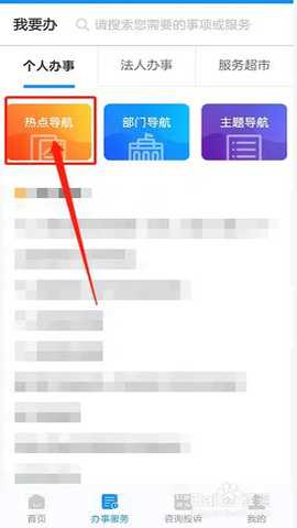 首先,打开【浙里办】,进入办事服务页面,点击【热点导航】。