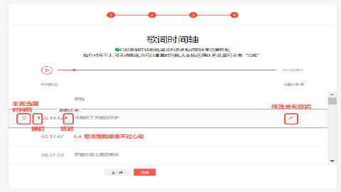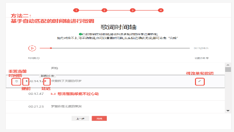 如果需要对单句歌词的时间轴进行调整,可点击时间戳两侧的箭头,提前或延后时间。