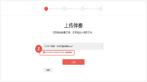 (1)上传伴奏文件:点击“选择文件”,上传你的伴奏文件。支持上传WAV、M4A、MP3等常见音频格式,但建议上传WAV格式。音质须在320kbps以上,文件不超过200MB。上传前请您阅读版权相关协议并勾选。