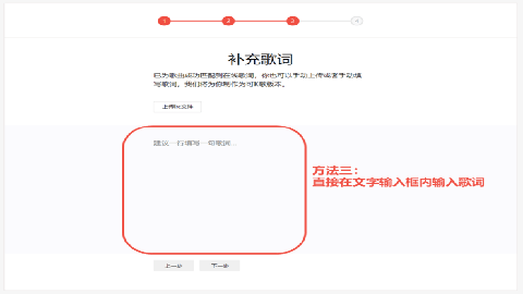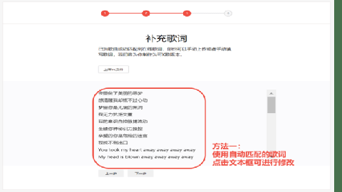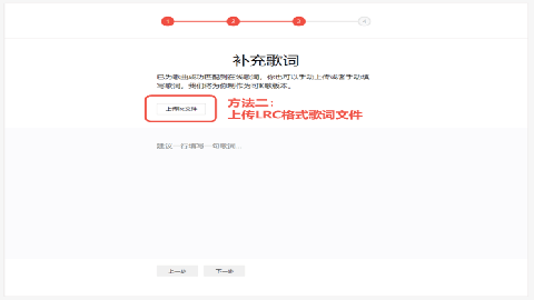 (3)补充歌词:如果你上传的是平台已有的伴奏,系统会自动填充歌词,你可直接使用,有需要微调的歌词,可在文字框内进行修改。你还可以选择上传LRC格式歌词文件,或者直接在文字输入框内输入歌词。