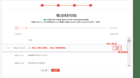 如果需要修改单句歌词,点击该句歌词后方的修改按钮,对该句歌词进行编辑。点击编辑歌词按钮后将出现勾和叉,点击勾表示确认修改,点击叉表示取消修改。