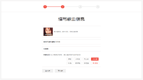 (2)填写歌曲信息:输入歌曲名、歌手名后,系统将自动匹配封面,如对封面仍不满意可点击“修改封面”上传图片。选择对应的伴奏标签,可点击“添加”输入其他标签,自定义标签字数建议3~5字。