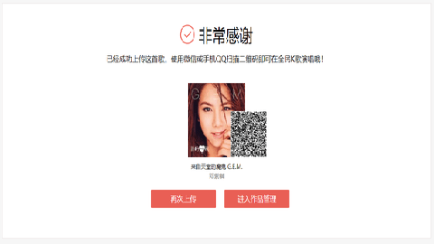 (7)上传完成:完成以上步骤后,你可通过微信或手机QQ扫码在全民K歌APP演唱该伴奏。点击“再次上传”,可继续上传其他伴奏。点击“进入作品管理”,可进入作品管理页,查看和管理所有已上传伴奏。