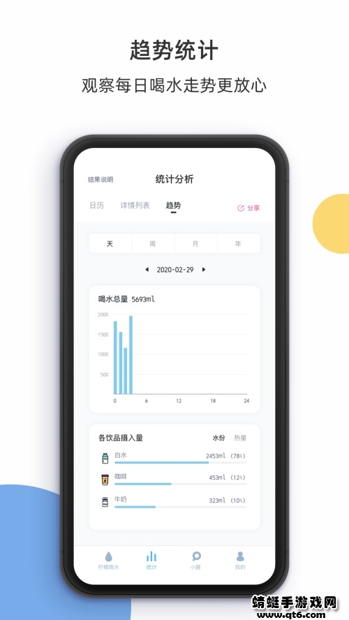 3.观察每日喝水走势不担心, 我们提供日历和趋势图两种呈现方式, 帮您最有效的制定喝水计划和展示您的喝水记录。