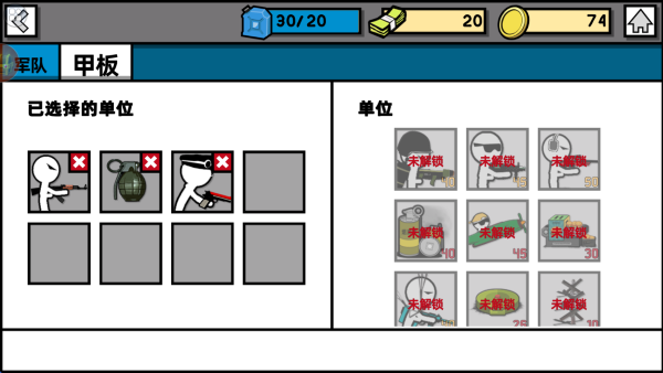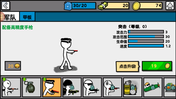 4、玩家可以利用资源对你的兵种进行解锁以及升级,提升火柴人的战斗力。