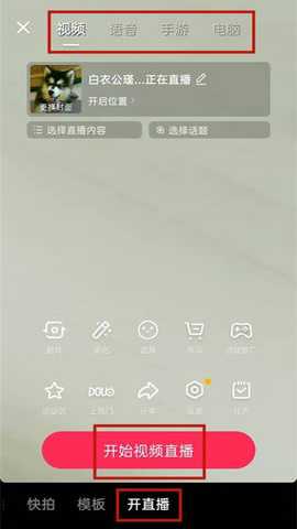 第二步:点击直播,选择直播类型后,点击开启直播即可。