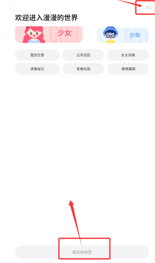 1、启动应用后,可点击右上角跳过标签选择,直接进入首页