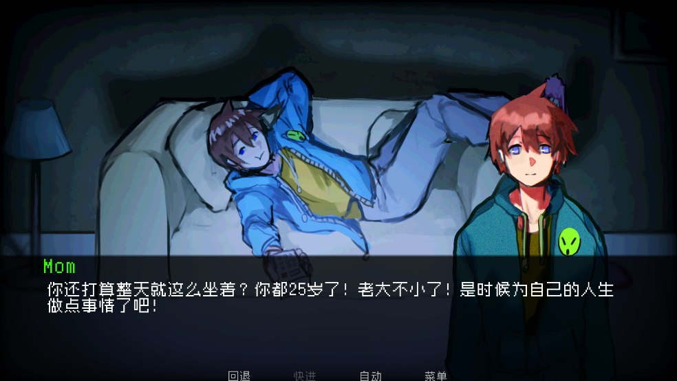 5、当我们进入剧情我们可以看到,男主已经25岁了还是家里蹲,终于被不满的亲妈丢出了家门自谋出路。