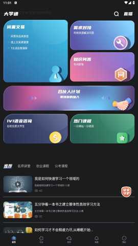 2、大学通提供了限制交易、知识问答、创业合伙人、在线咨询等服务功能,以及名师讲堂、公考、创业等视频、直播课程。