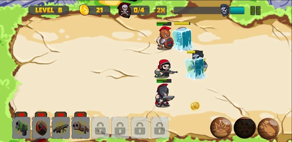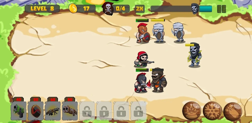 给你的勇士装配不同的武器吧,他们会自动对敌人发起攻击!根据敌人数量的多少,派遣自己的勇士上场,对方人数低于六人的话,只派三名勇士就够了!一个拿散弹枪,一个拿冰冻枪,这样范围性的伤害和技能型的武器就都有了!斯巴达勇士:英雄冲突(Warrior of Sparta: Hero Clash)游戏会设置八个装备栏,前面四个是免费开放的哦!