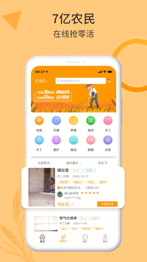 1.随时随地释放就业需求:一键召唤身边最靠谱的工人,根据需求自动匹配合适的技能,多维度排序。