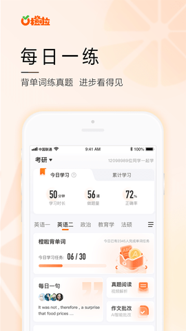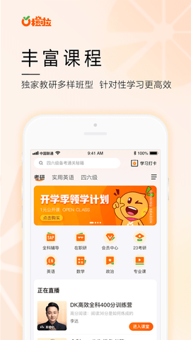 橙啦app是北京学橙归来科技有限公司推出的考公考研辅助学习软件,是一款服务年轻人的高质量学习app,主要提供了英语四六级、考研课程等学习服务。橙啦公考平台延伸至实用英语、家庭教育、职业教育等丰富成人教育课程体系,通过优质直播体验及至臻学习辅导服务每一位学员。