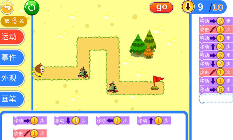 【寓教于乐】通过悟空一行西游取经的故事,通过搭建程序积木块,实现移动、攻击打怪、解救师傅等环节。寓教于乐,轻松学编程。