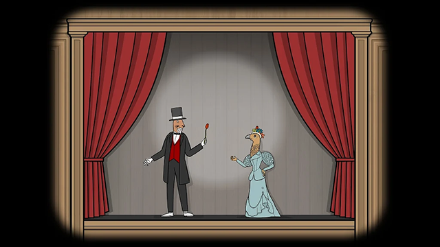 游戏延续锈湖系列标志性的超现实风格,通过手绘美术、魔幻配乐与压抑音效,营造出荒诞又令人不安的魔术秀场氛围。观众反常的反应(如兔子先生“死亡”时鼓掌欢呼)进一步强化了心理冲击,让玩家始终处于真假难辨的沉浸体验中。