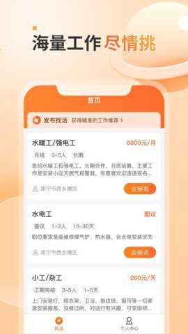3、智能信息匹配功能能够根据您的需求,优先推荐离家近的招工找活信息,让您更加方便地选择合适的工作岗位。