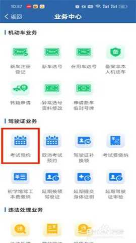 然后在业务中心的页面中可以看到有考试预约、取消考试预约、驾驶证换领等我们点击【考试预约】;