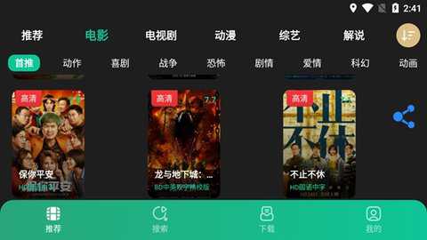 荐片影视大全中有着海量影视资源可以让影视爱好者们免费观看,爱奇艺、优酷、腾讯视频等国内各大知名影视网站的热门视频都能在应用中找到,视频种类丰富,电影、电视剧和综艺节目都有,能够满足不同用户们的追剧需求,想要观看的影视剧直接搜索剧名就能观看,每天都会同步更新,不用担心自己会剧荒。
