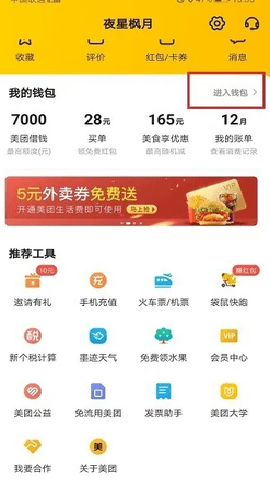 第一步手机上打开美团,进去我的界面,点击我的钱包,如下图所示: