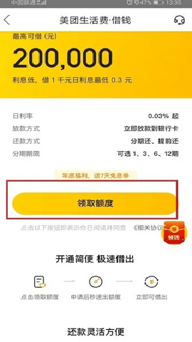第三步美团生活费借钱界面之后,点击领取额度,如下图所示: