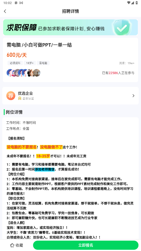 您在完善简历后,可以在“首页”岗位列表中选择您心仪的岗位,在“招聘详情”页的右下角点击“立即报名”。如果您的条件符合雇主要求,报名成功后需要根据弹出的雇主联系方式或者在线与雇主取得联系。