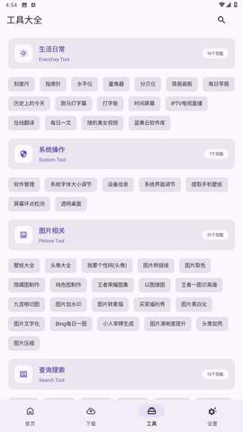 软件内还含有工具大全,不管是自生活、工作、学习上,小伙伴们都可以用得到,如生活日常、系统操作、图片相关、查询搜索、资源提取、文字相关、其他工具等相关功能,总之,这是一款实用万能免费无广告的百宝箱。