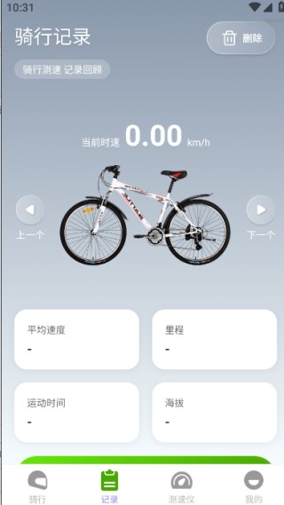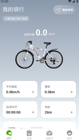 2、进入骑行专属页面后,可清晰查看平均速度、运动时长、海拔高度以及骑行里程等数据。