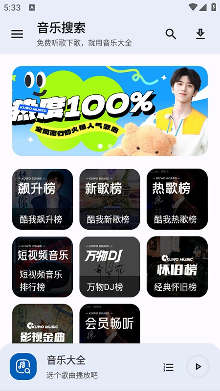 音乐大全app是一款聚合多平台音乐资源的应用,不用注册就能直接听、随便下载,搜歌名歌手都方便,在线播流畅,能选不同音质保存、自己整理歌曲,全程不花钱也没广告。不光能找各种音乐资源,还有现成歌单和热门榜单,界面跟功能都能按自己喜好改,找新歌特别省事,听歌用着顺手又省心,日常想听什么都能快速找到,长时间用也不会被打扰。