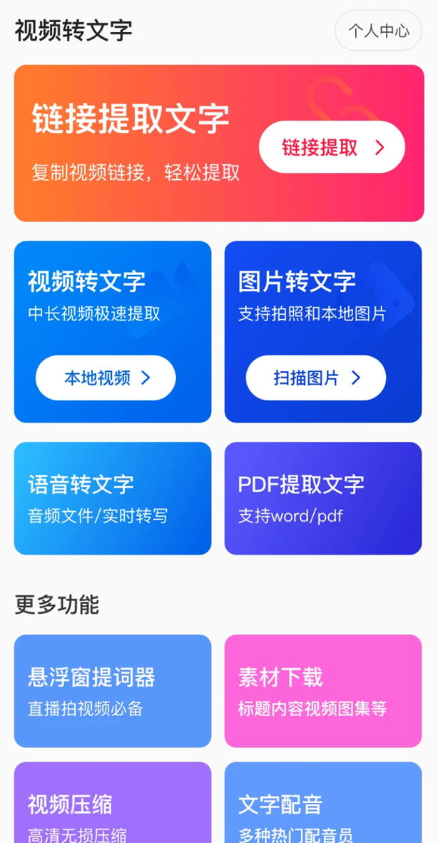 视频转文字君是一款专业高效的文字识别提取工具,这款工具能在线转换好多种格式的文件,用视频转文字君 app,能直接把视频转成文字、音频转成文字,能实时识别语音、翻译文本,识别速度快,结果也准,所有提取文字的相关操作都能在这一个地方搞定,不用来回切换其他工具,处理音视频内容想要省事又高效的话,直接下载下来用就可以了。