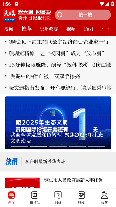 1、打开天眼新闻APP,首页汇聚贵州各类新闻媒体资讯及新闻政要相关内容。