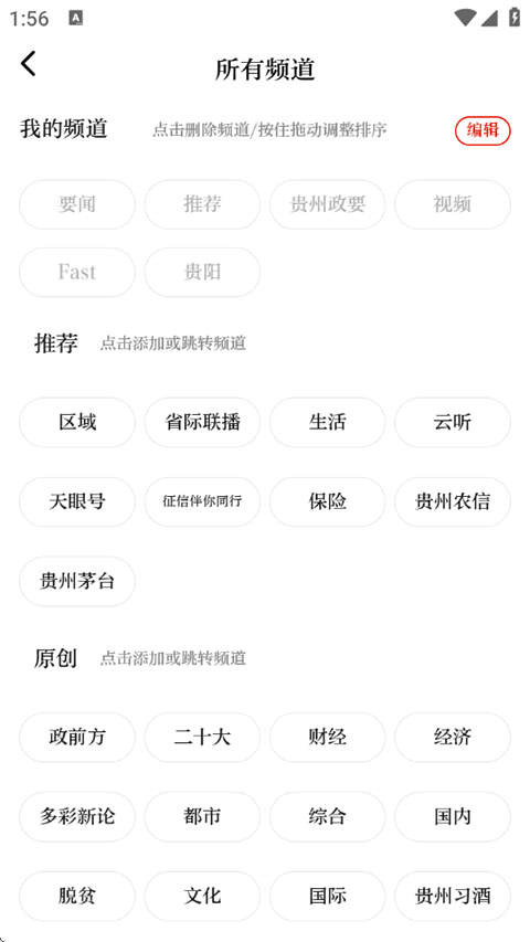 2、点击首页右上角的+图标,进入所有频道页面,可添加或删减首页展示的分类。