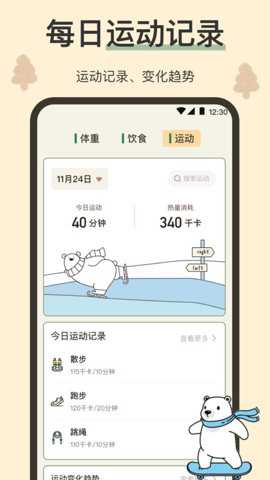 1、小熊体重通过各种不同的数据,它可以给你提供一些合适的健身体验。