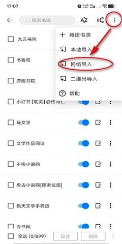 进入“书源管理”界面后,就可以看到内置的书源;点击右上角的三个点,并选择“网络导入”;